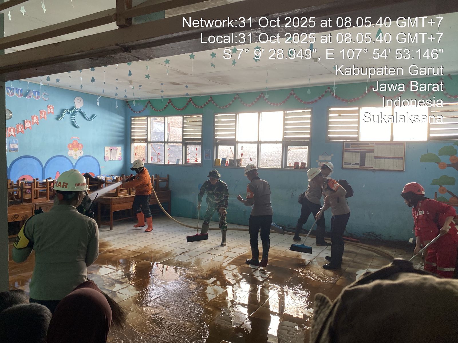 Brimob Jabar Bersama TNI dan Warga Bersihkan Sekolah Pasca Banjir di Kab. Garut