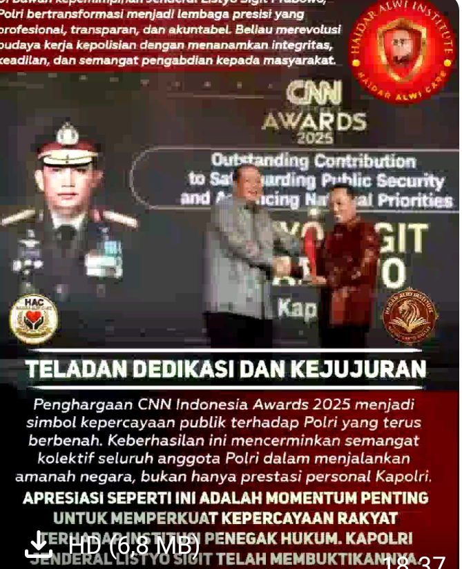 *“Apresiasi seperti ini adalah momentum penting untuk memperkuat kepercayaan rakyat terhadap institusi penegak hukum. Kapolri Jenderal Listyo Sigit telah membuktikan bahwa reformasi di tubuh Polri bukan wacana, melainkan kerja nyata yang membawa hasil dan kepercayaan, Tegas Haidar Alwi.