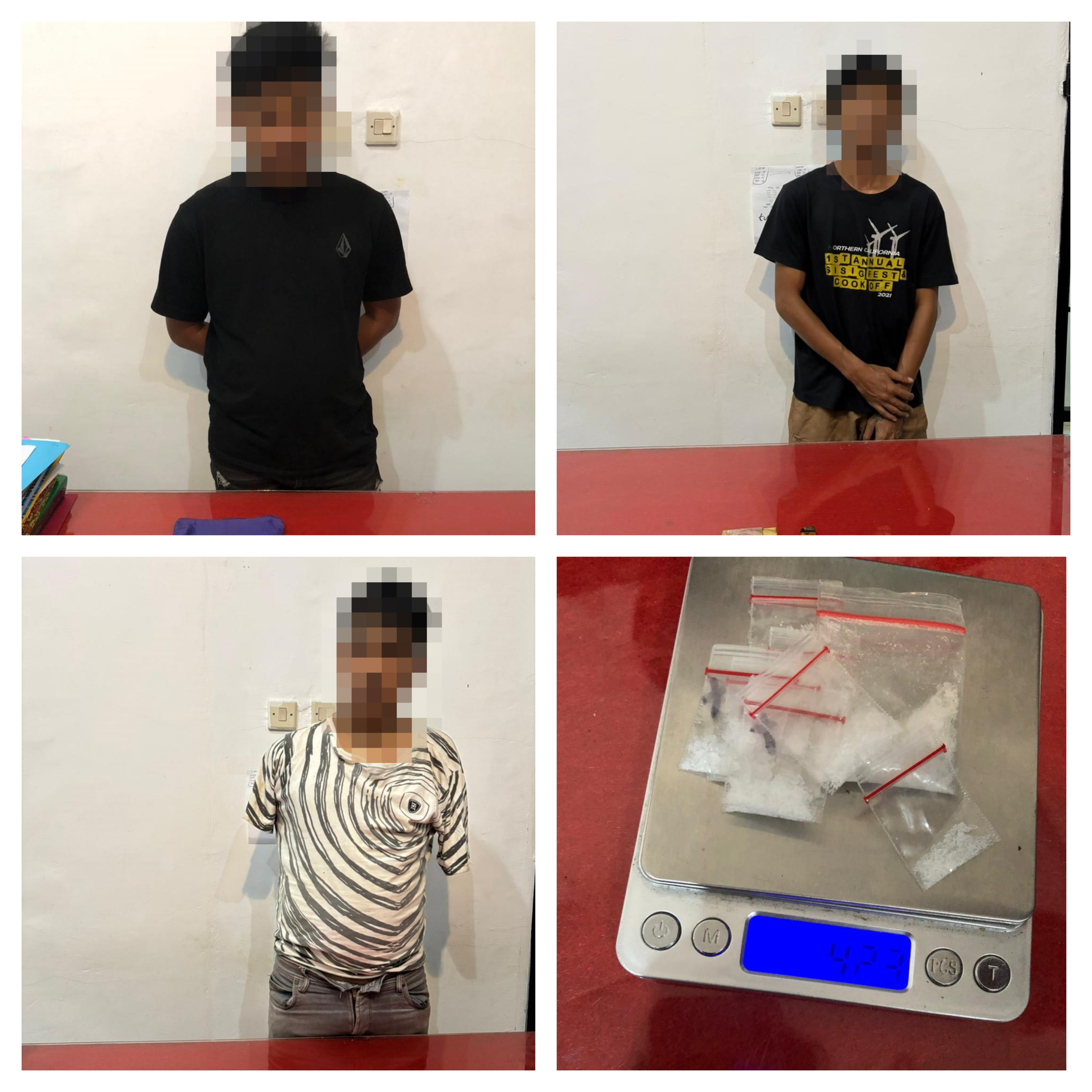 “ Dari informasi yang disampaikan warga, kami langsung melakukan penyelidikan dilapangan dan benar saja, saat pelaku MF ini kita amankan, turut juga kita temukan dari tangan pelaku sejumlah barang bukti berupa 9 kantong klip transparan kecil berisi serbuk kristal diduga narkotika jenis sabu dengan berat total 4,23 gram brutto, 2 buah timbangan digital, 1 buah pipet modifikasi sendok sabu, 2 buah dompet serta 1 buah handphone ” Ujar IPTU Dewa Made Surita.
