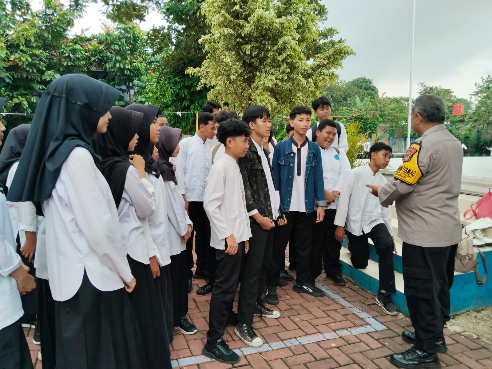 Bhabinkamtibmas Kelurahan Curug Kulon, AIPTU Sanjaya, dengan memberikan himbauan langsung kepada para siswa-siswi SMPN 4 Curug terkait pentingnya menjaga ketertiban, disiplin, dan menjauhi perilaku menyimpang yang dapat merugikan diri sendiri maupun orang lain.