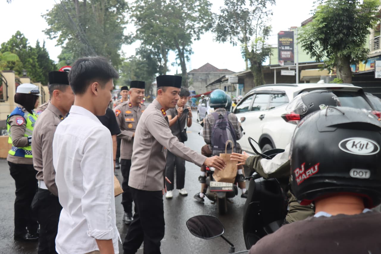 Dalam suasana penuh keakraban, anggota kepolisian bersama para mahasiswa turun langsung ke jalan membagikan paket takjil kepada para pengendara dan masyarakat yang melintas.