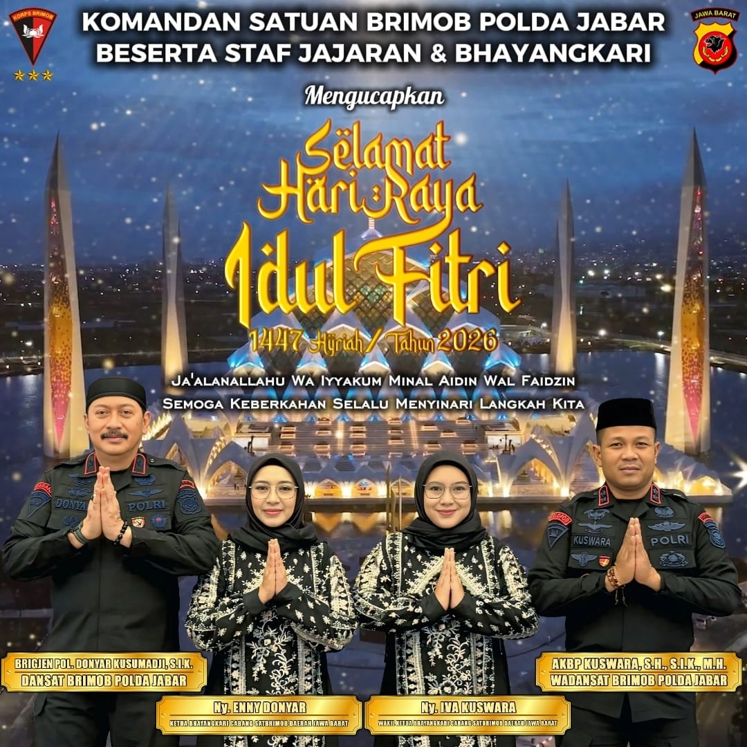 Sumedang, brigadenews.co.id – Dalam rangka menyambut Hari Raya Idul Fitri 1447 Hijriah, Komandan Satuan Brimob Polda Jawa Barat beserta jajaran staf dan Bhayangkari menyampaikan ucapan selamat kepada seluruh masyarakat, khususnya di wilayah Jawa Barat.