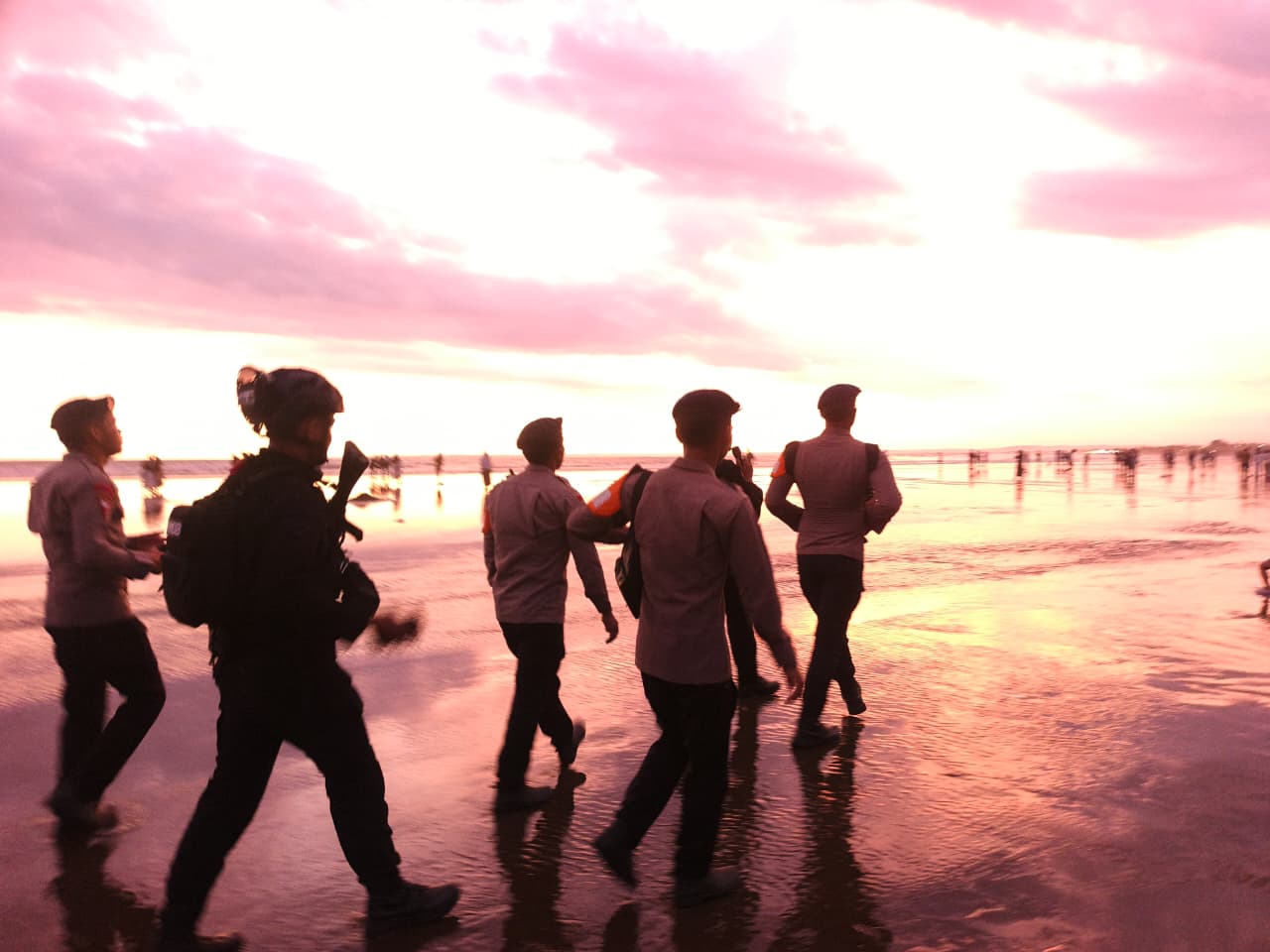 Menjelang sore hingga petang, personel SAR kembali mengingatkan para wisatawan untuk berhati-hati seiring meningkatnya pasang air laut di kawasan pantai.