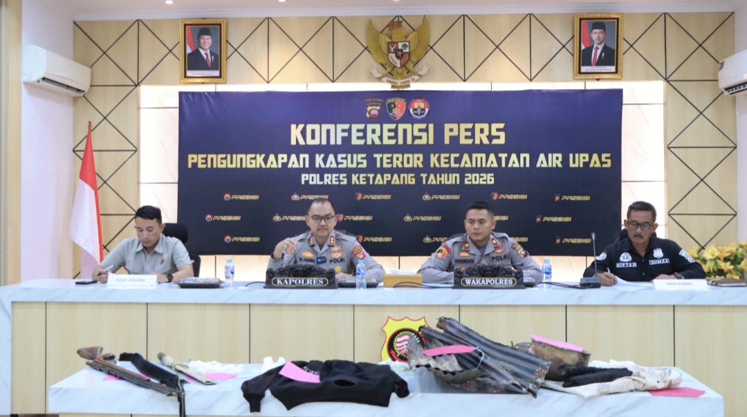 Ketapang, Brigadenews.co.id – Polda Kalbar, Polres Ketapang menggelar konferensi pers terkait pengungkapan dan penanganan kasus teror yang terjadi di wilayah Kecamatan Air Upas. Dalam kegiatan tersebut, pihak kepolisian menyampaikan kronologi kejadian, proses pengungkapan kasus, hingga penetapan tersangka beserta barang bukti yang berhasil diamankan (30/04/2026).